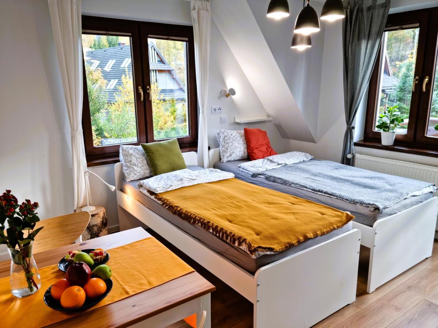 Pokój dwuosobowy. The double rooms kitchenette, which features a refrigerator and kitchenware, is available for cooking and storing food. The double room offers soundproof walls, a tea and coffee maker, a balcony with mountain views as well as a private bathroom featuring a shower. The unit offers 2 beds. Pokój Dwuosobowy - 2 osobowy. Powierzchnia pokoju ok.: 19 mkw. ;